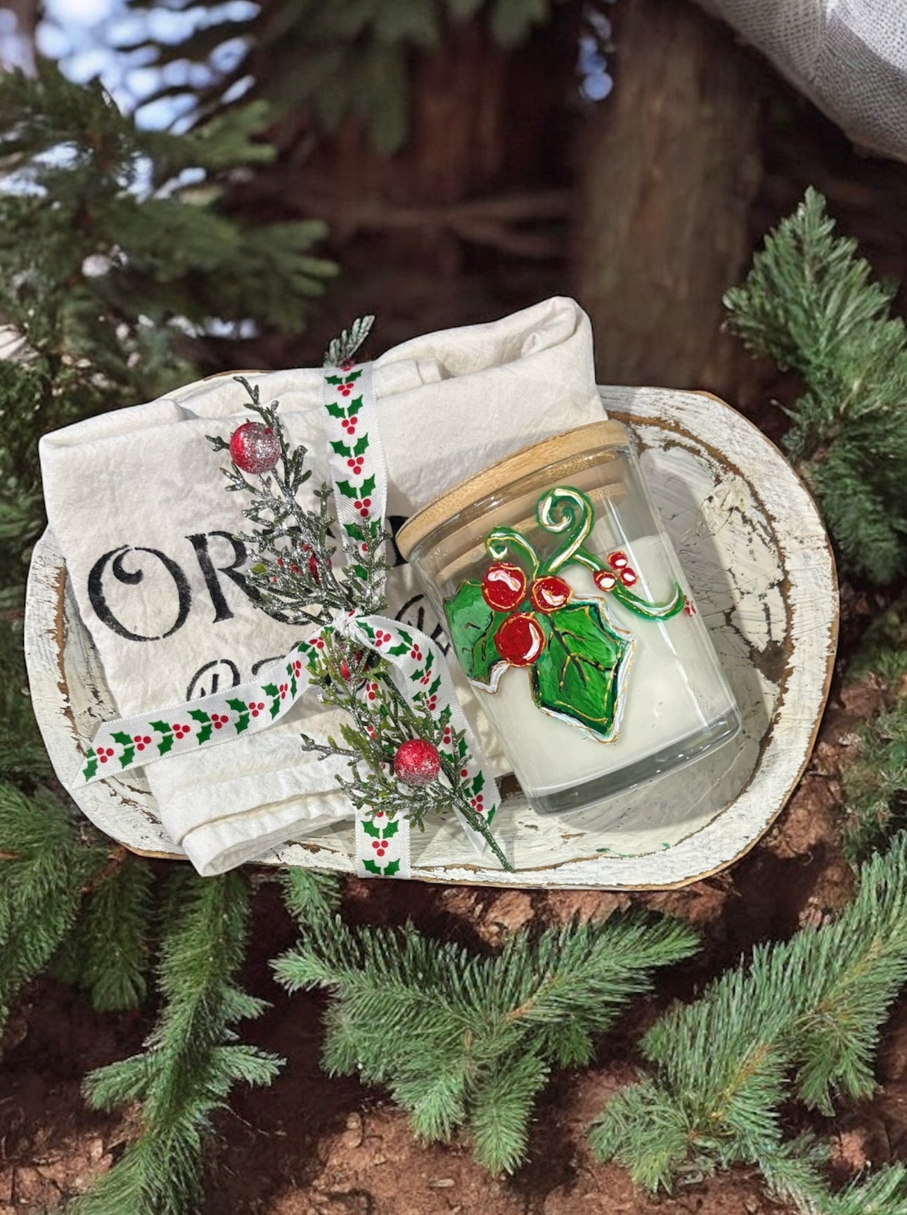 White vintage dough bowl filled with hand stenciled North Pole Bed and Breakfast dish towel and a Christmas candle. Dough bowl is approximately 8”x 5”. Great for holiday gift giving