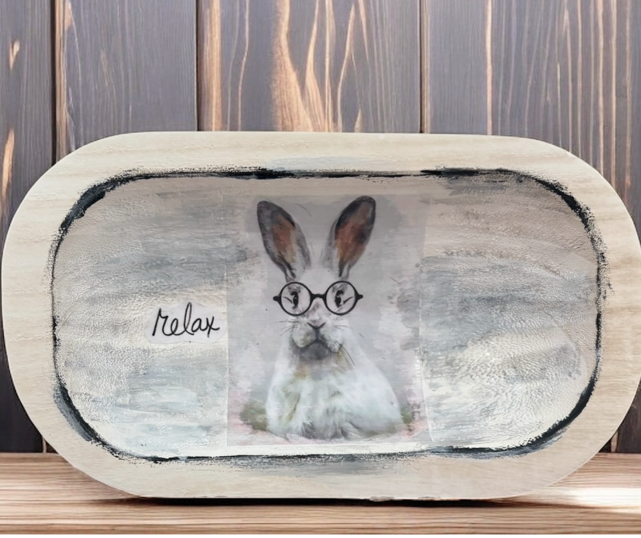 Cute bunny design on inside of bowl which is filled with a soap bag, bath mitt, foot brush, lavender shower steamers and goats milk& lavender soap, all to keep you feeling refreshed. Dough bowl can be used for many things. Approximate size is 9”x6”. Relax and unwind.